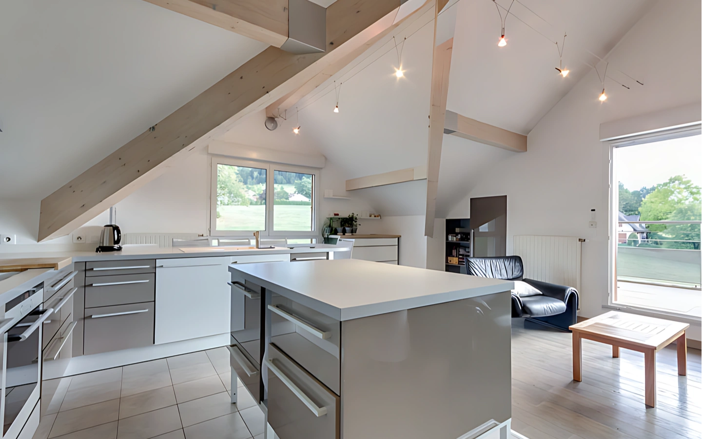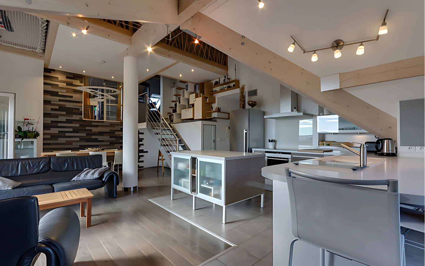 Il propose des volumes intéressants avec une belle hauteur sous plafond et des prestations de qualité. Salon avec cuisine équipée donnant sur une terrasse exposée Sud-Ouest, un grand dégagement pour organiser un bureau ou un salon TV, une mezzanine, 3 chambres avec une SDB et une suite parentale avec dressing, salle de douche et WC. Plusieurs rangements et équipements ont été aménagés pour optimiser les sous pentes.