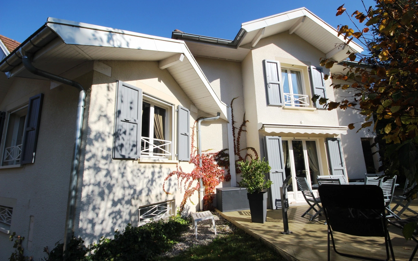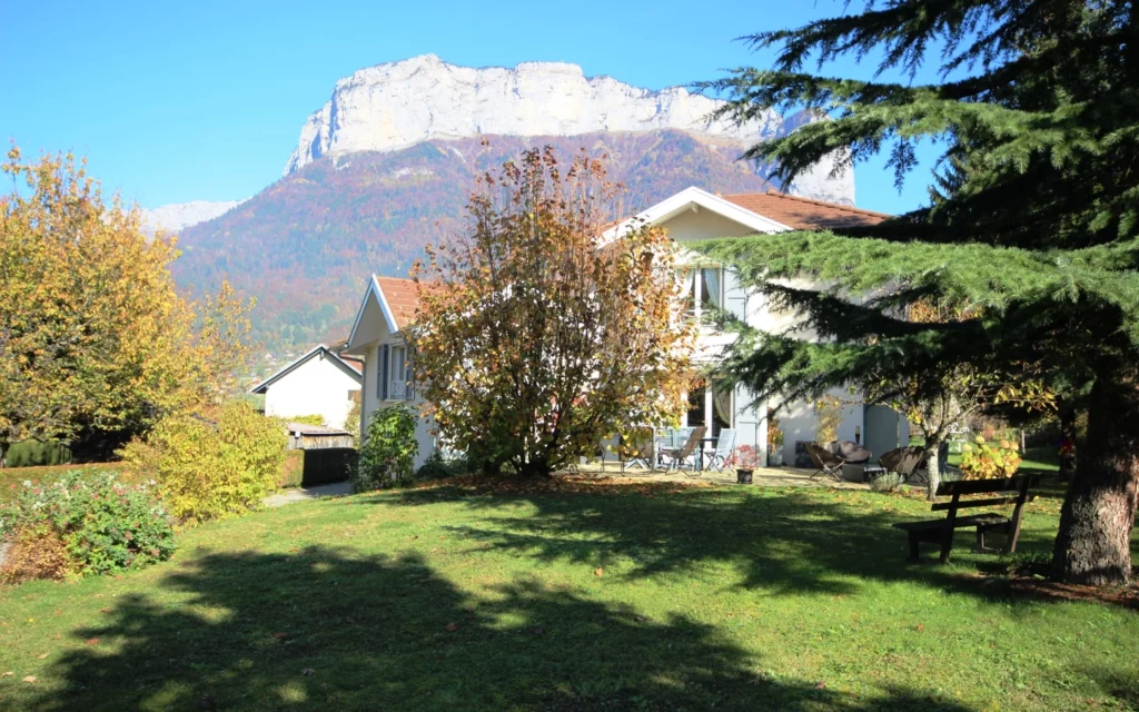 Très belle maison parfaitement entretenue située dans un environnement paisible avec une vue panoramique sur les montagnes. Vaste pièce principale donnant sur une terrasse exposée plein Sud, cuisine équipée, 3 chambres, bureau, dressing. Sous-sol complet avec double garage, buanderie, atelier, cave. Terrain arboré et paysagé de 1200 m²